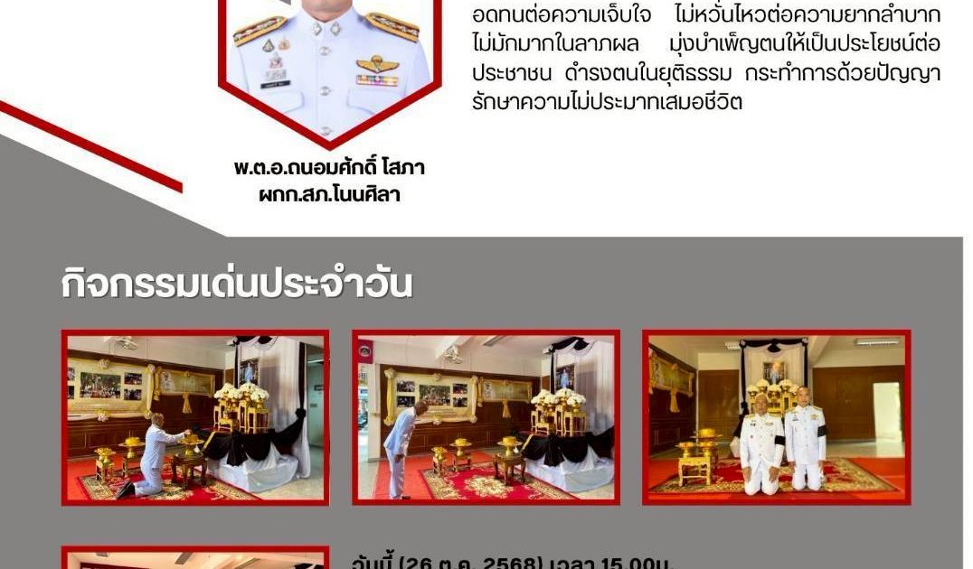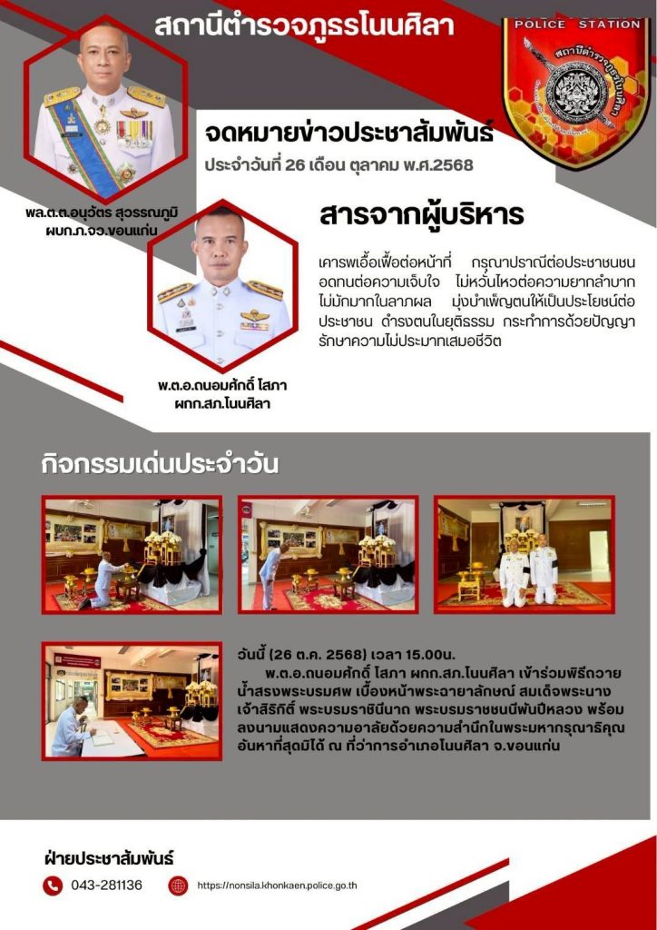 พ.ต.อ.ถนอมศักดิ์ โสภา ผกก.สภ.โนนศิลา พร้อมข้าราชการตำรวจ สภ.โนนศิลา ร่วมพิธีถวายน้ำสรง 26 ตุลาคม 2568 โดย admin / ประจำเดือน ตุลาคม อก. วันที่ ( 26 ต.ค. 68 ) เวลา 15.00 น.พ.ต.อ.ถนอมศักดิ์ โสภา ผกก.สภ.โนนศิลา พร้อมข้าราชการตำรวจ สภ.โนนศิลา ร่วมพิธีถวายน้ำสรงพระบรมศพ เบื้องหน้าพระฉายาลักษณ์ สมเด็จพระนางเจ้าสิริกิติ์ พระบรมราชินีนาถพระบรมราชชนนีพันปีหลวง Facebook iconFacebookTwitter iconTwitterLINE iconLine